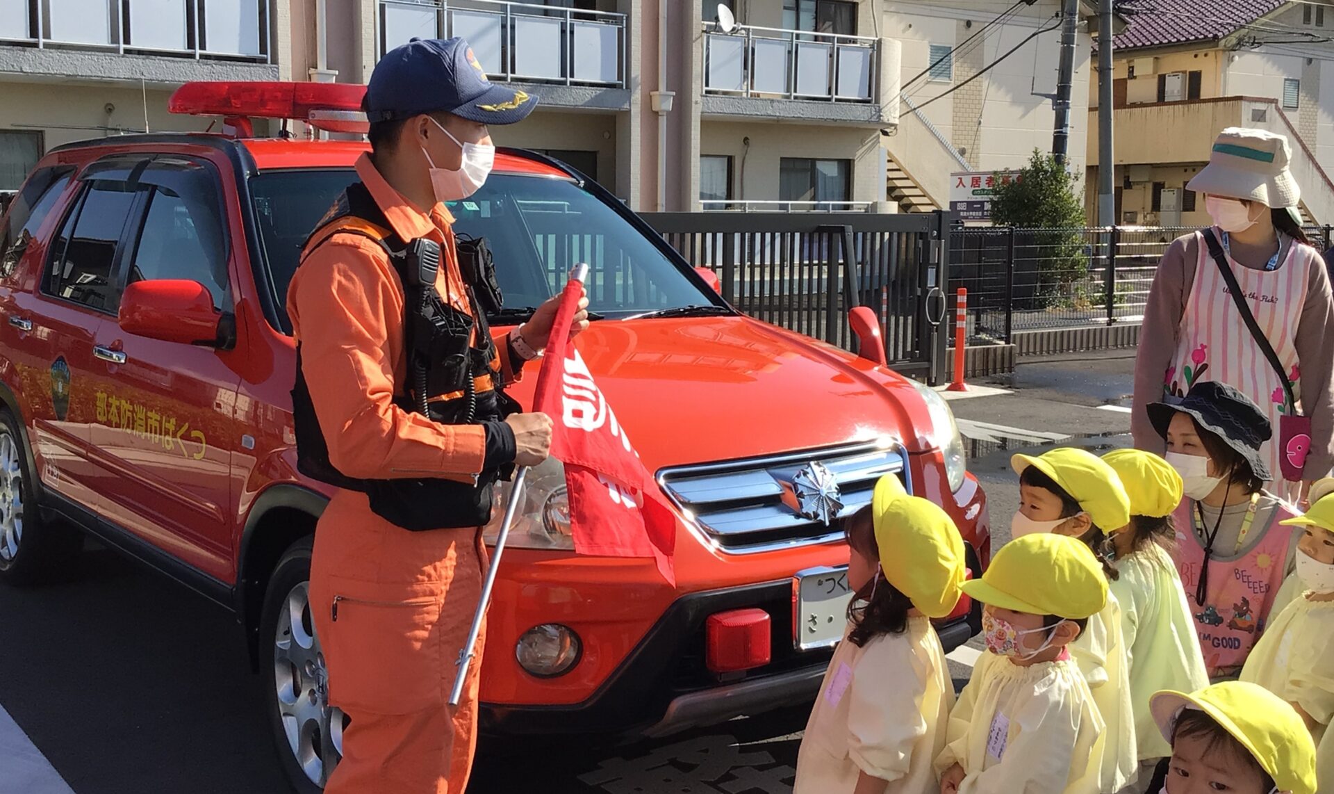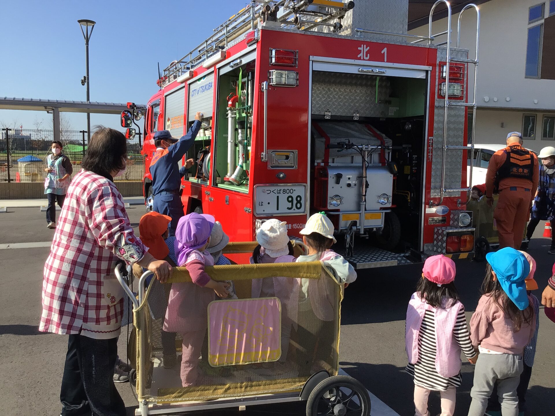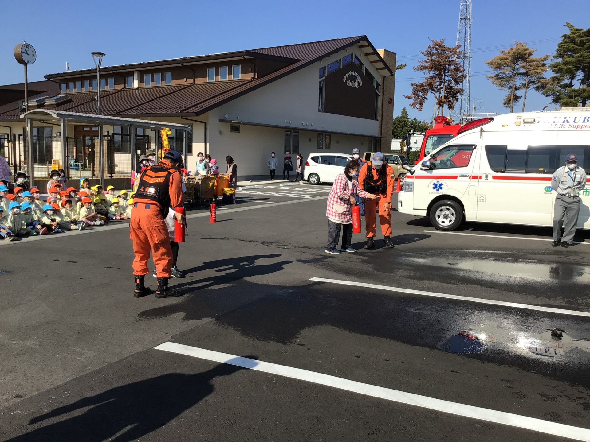 通報訓練と消防車ホーム > 通報訓練と消防車通報訓練と消防車更新日:2021年12月1日通報訓練をしました。 消防署の方々が来てくださり、講評をいただいた後、消火器の使い方を教わったり、普段はなかなか見る機会のない消防車を見せていただきました。 職員にはもちろん、子ども達にとっても、とても有意義な時間でした。 消防署の皆様、ご協力誠にありがとうございました。